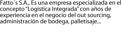 Fatto´s S.A., Es una empresa especializada en el concepto “Logística Integrada” con años de experiencia en el negocio del out sourcing, administración de bodega, palletisaje, embalaje, transporte, distribución, courier, delivery, cobranza y recaudación. El tiempo y los conocimientos adquiridos nos han especializado en las distintas áreas y requerimientos que el mercado exige. Por esta razón desarrollamos una estructura técnico administrativa que optimiza el buen desempeño de la prestación de servicios, en áreas claramente definidas.